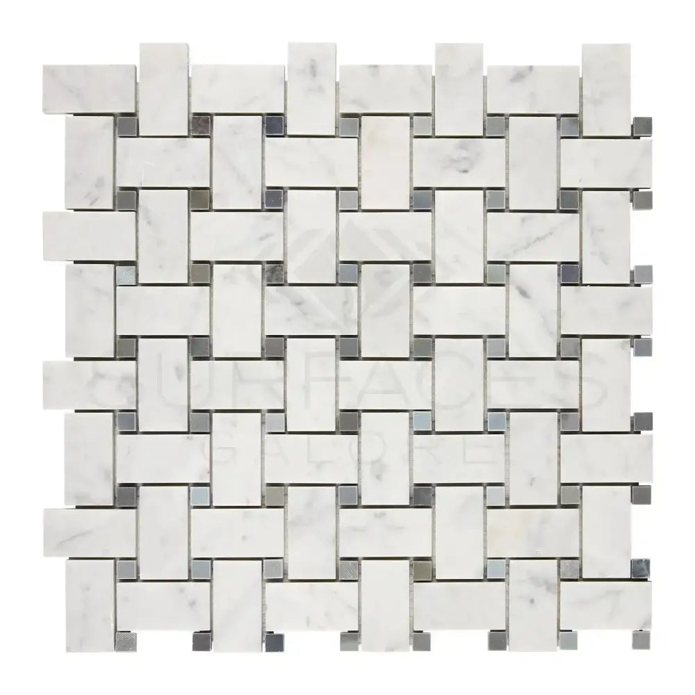 Carrara White Royale Basketweave (w/ Blue-Gray) Mosaic Marble Tile