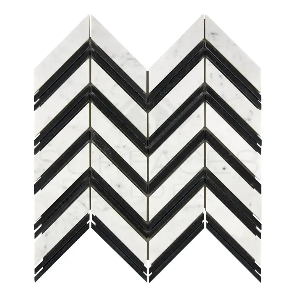 Carrara White Royale Chevron (LARGE) (w/ Carrara White Royale / Black) Mosaic Marble Tile