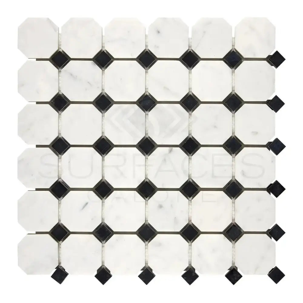 Carrara White Royale Octagon (w/Black) Mosaic Marble Tile