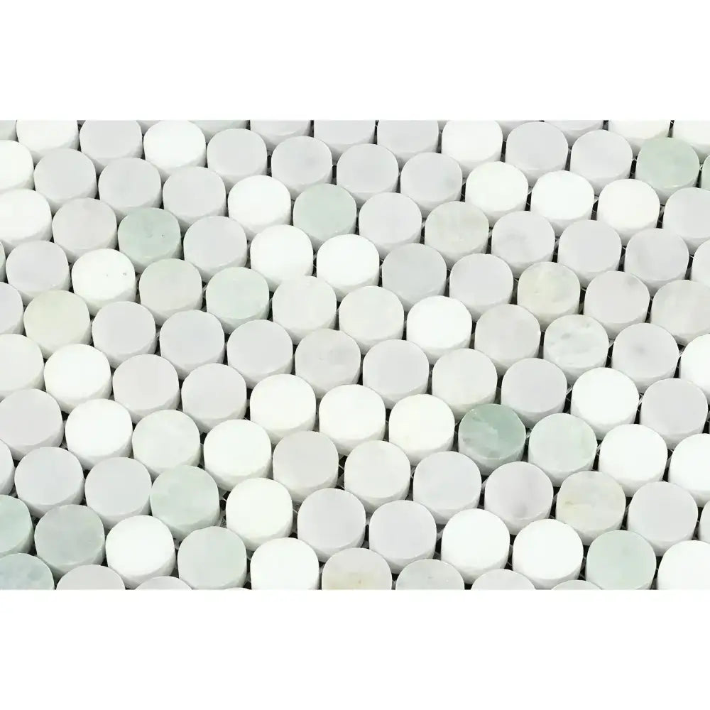 Introducing the exquisite Carrara White Penny-Round Mosaic Tile—an exceptional representation of elegance and refined luxury. Expertly crafted from genuine Italian marble, this tile artfully blends the soft white hues of Carrara, luminous Thassos, and subtle Ming Green accents, creating a sophisticated color palette that enhances a variety of interior styles. The combination of polished and honed finishes offers dynamic visual interest, making this mosaic ideal for elevating the atmosphere in both residential and commercial settings. Whether revitalizing a kitchen, bathroom, or statement wall, Carrara White Mosaic Tile is a versatile and timeless solution that effortlessly bridges classic charm and modern appeal.