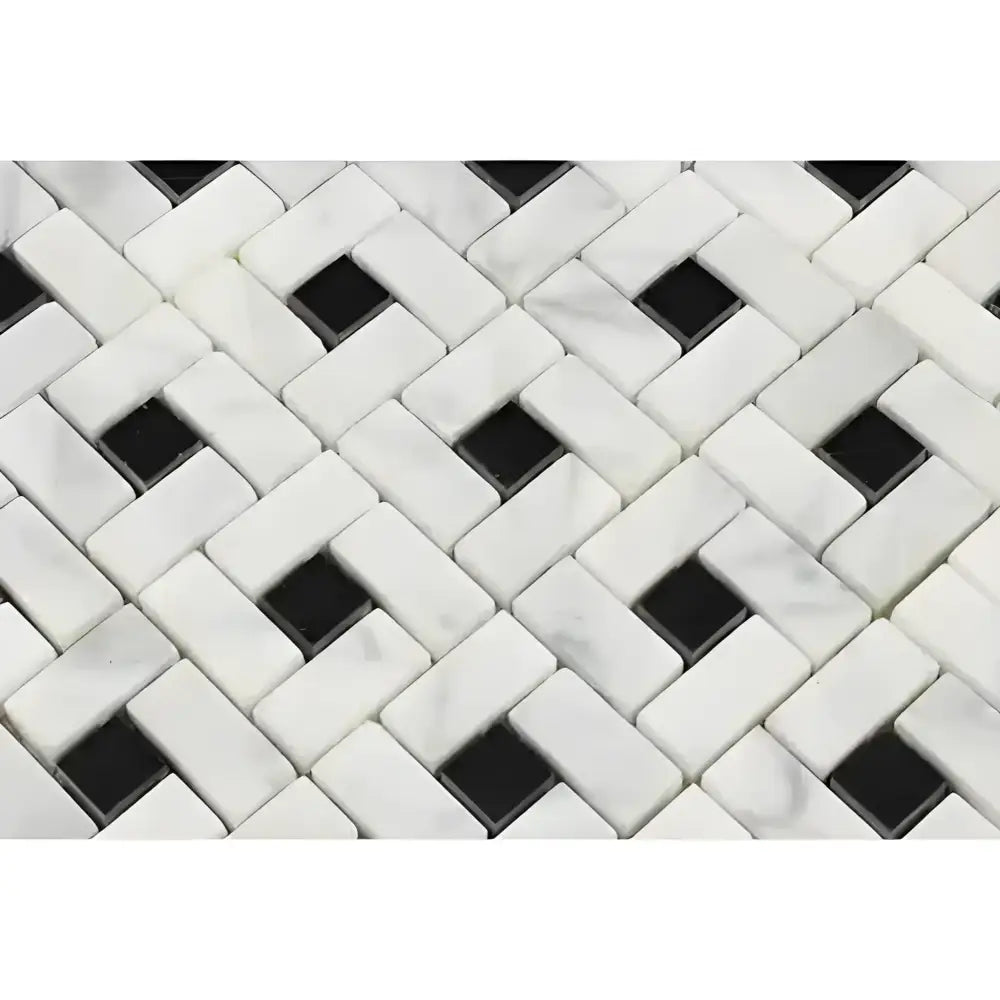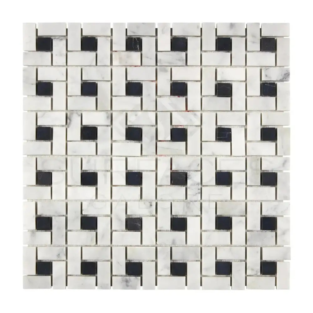 Introducing the exquisite Carrara White Pinwheel Mosaic Marble Tile, a stunning blend of luxurious design and timeless elegance. This sophisticated marble tile brings a refined touch to interiors by combining the classic beauty of Italian Carrara marble with distinctive pinwheel patterns and sleek black accents. The pristine white surface, paired with striking geometric details, delivers an eye-catching visual contrast—ideal for enhancing kitchens, bathrooms, shower walls, accent features, and upscale commercial environments.