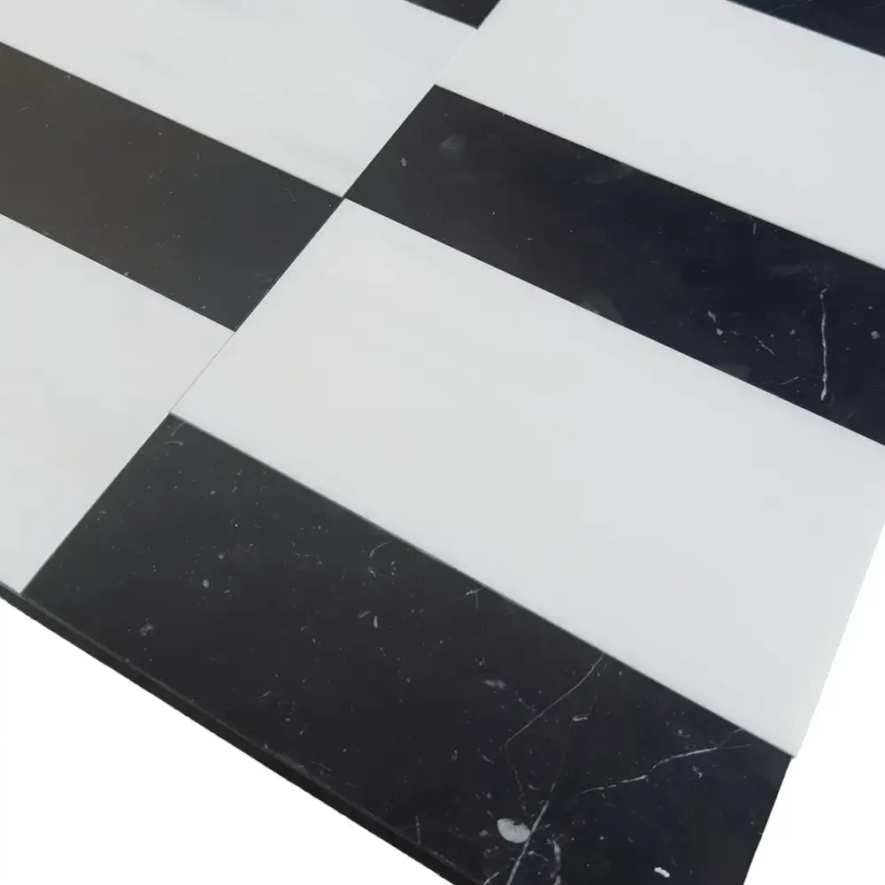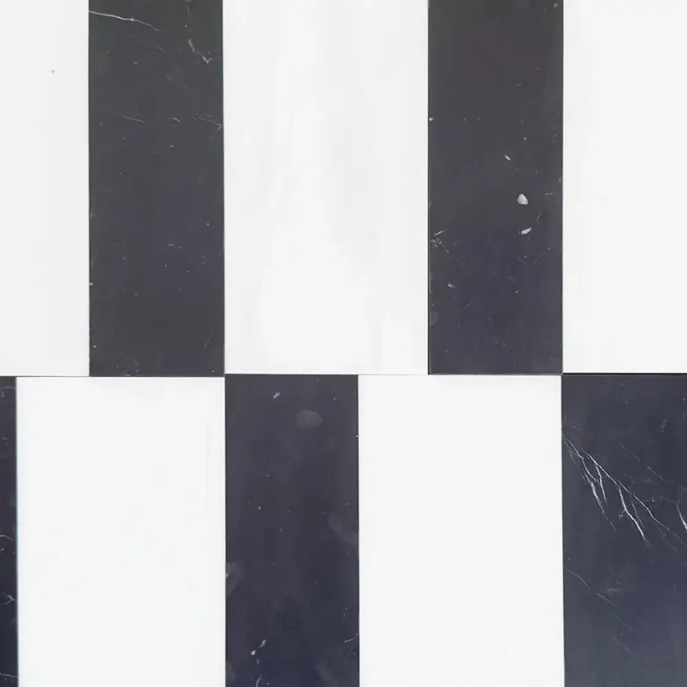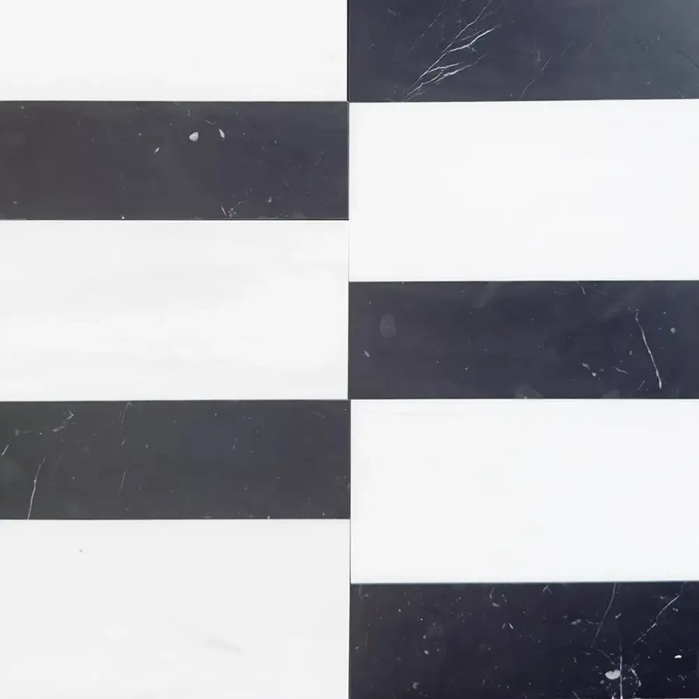 Introducing the exquisite Siena set, featuring Bianco Dolomite 6x12 and Nero Marquina 4x12 marble tiles, expertly crafted to elevate interiors with a refined touch of sophistication. These natural stone tiles are perfectly suited for both residential and commercial spaces, seamlessly enhancing bathrooms, kitchens, entryways, and other areas where elegance and superior functionality are desired. The harmonious contrast between the polished, glossy Bianco Dolomite and the richly textured, honed finish of Nero Marquina delivers a dynamic visual effect—an interplay that not only captivates the eye but also complements durable, high-traffic surfaces.