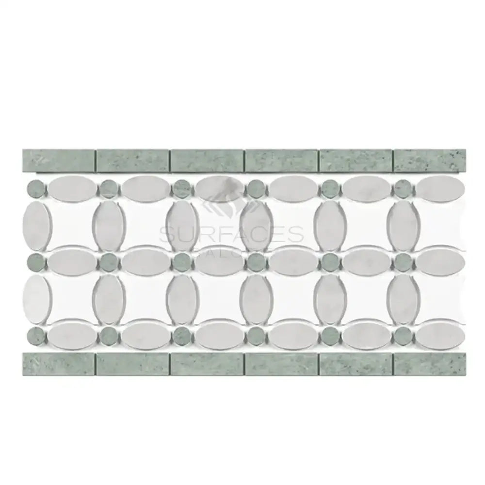 Thassos Supreme 5 3/4X11 1/4 Florida Flower Border (Thassos Supreme +White Carrara(Oval)+Ming-Green(Dots) Marble